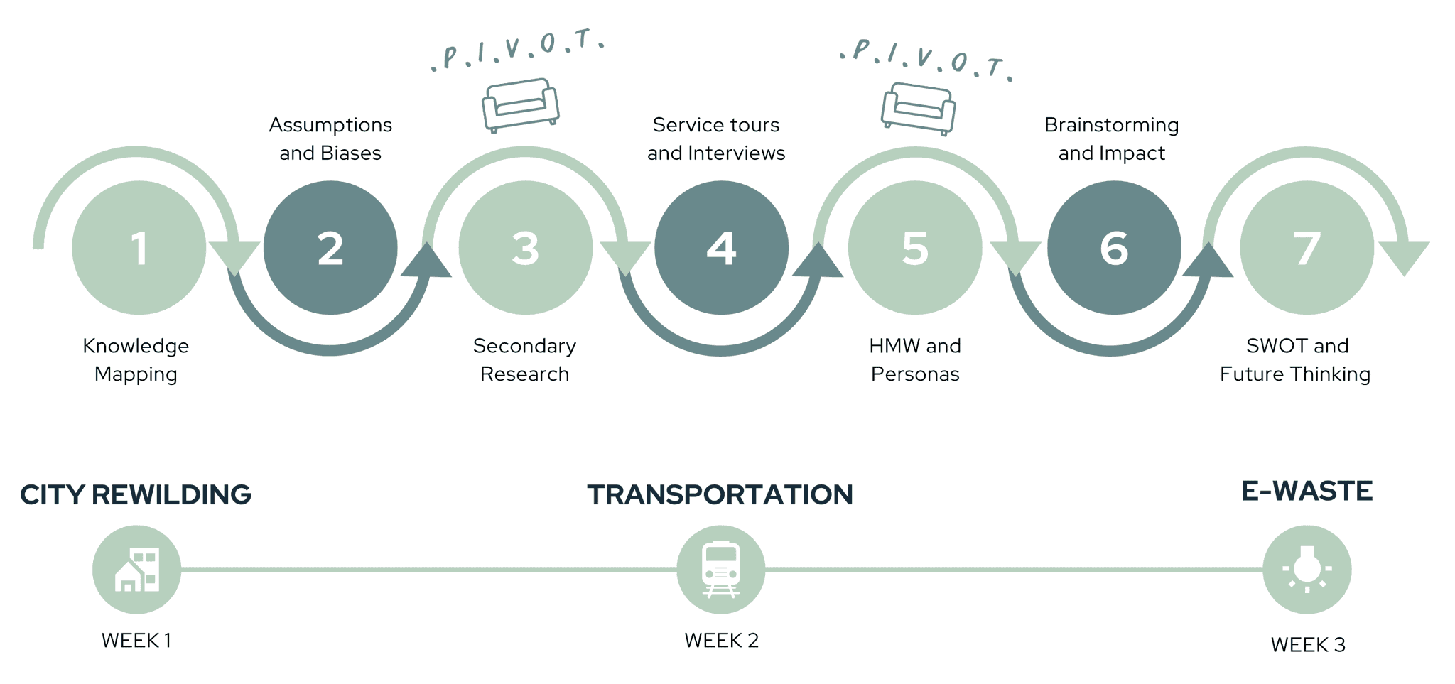 The team went through multiple topic pivots in an agile manner through phases of research, define and ideation.
