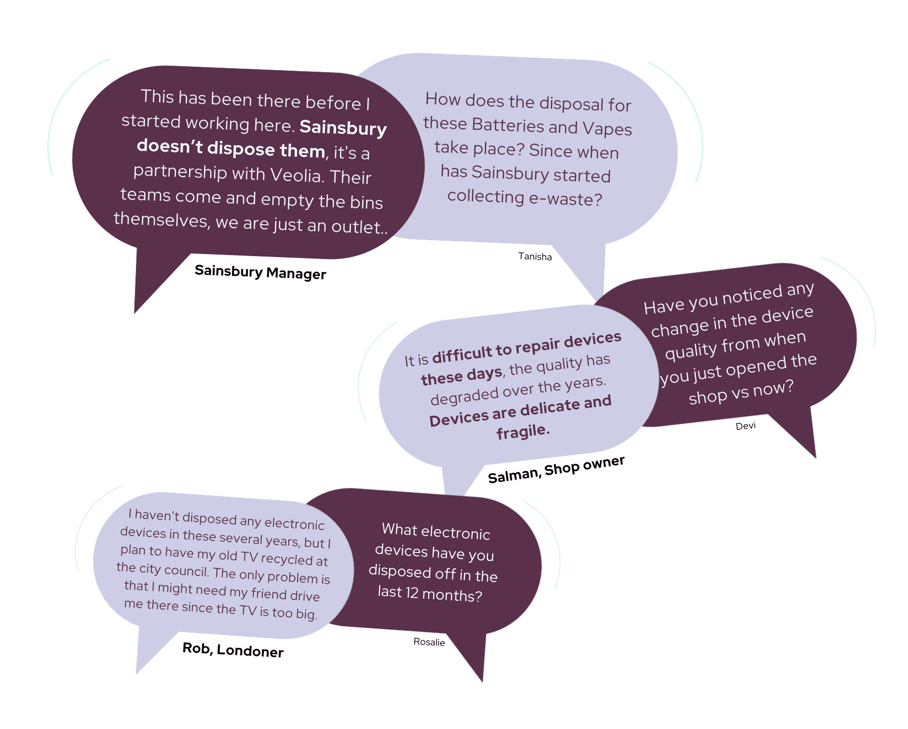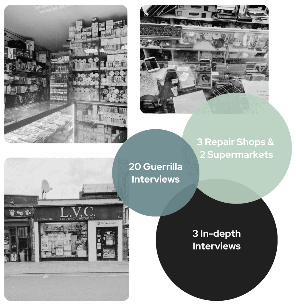 We engaged with a Sainsbury branch manager, repair shop owner and staff. We observed a mix of behaviours, from cautious interest to visible frustration about e-waste and its disposal.