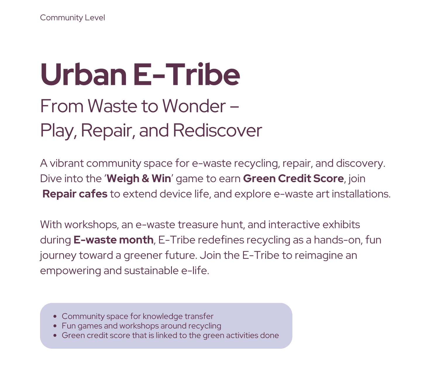 E-Tribe — a community hub for workshops, repair support, and recycling games.