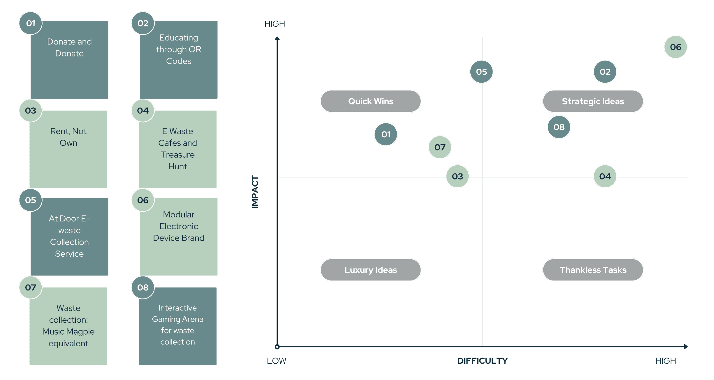 Later, the Innovation matrix revealed the gaps in existing solutions around e-waste repair and recycling in the UK along with validating the scope of our solutions in the real world.