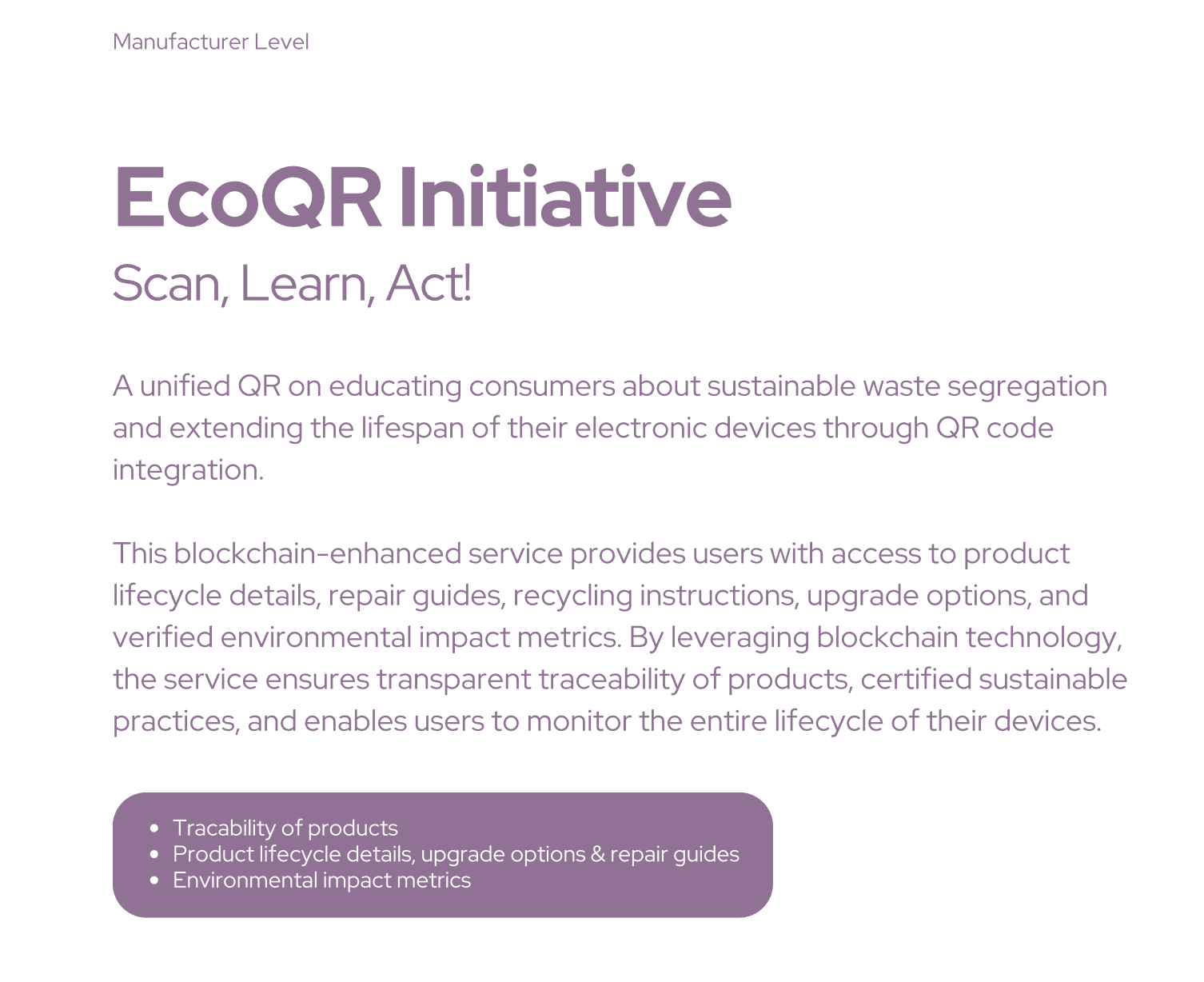 EcoQR — a unified QR-based tool for consumer education, repair access, and product traceability.