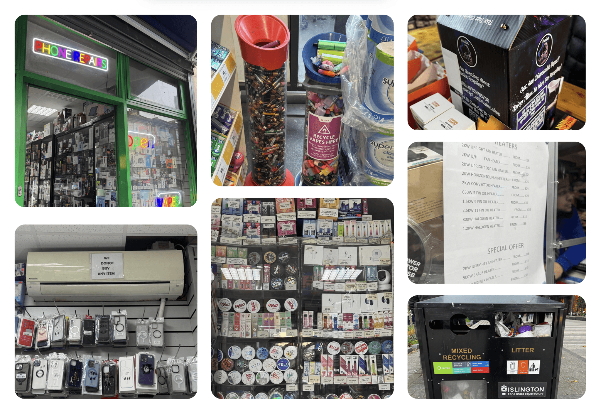 Our ethnographic research across vape shops, device repair shops, and Sainsbury Local revealed diverse e-waste practices, with limited recycling options and varying levels of consumer awareness.